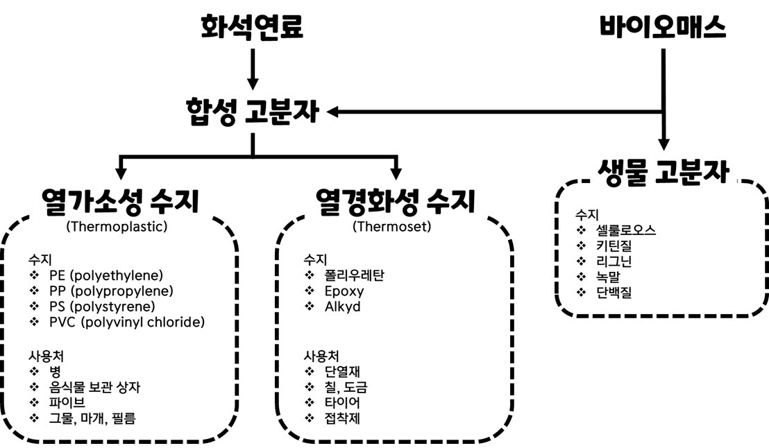 합성 고분자인 플라스틱은 두 가지로 나눌 수 있는 데, 기준은 열에 대한 반응이다. 열가소성 수지*는 열을 가하면, 부드러워져 변형이 일어나는 것을 말한다. 반면, 열경화성 수지는 열을 가할수록 단단히 합쳐지는 물질을 이른다.