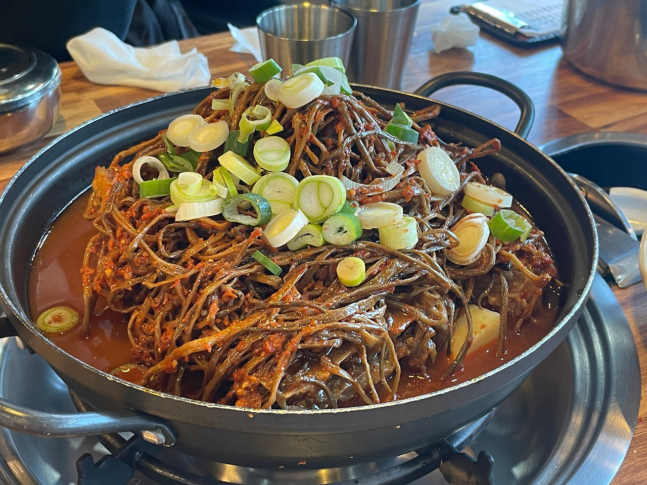 고구마 줄기가 가득한 감자탕. 점심시간을 비껴갔지만, 여전히 사람으로 가득한 식당에 다행히 한자리가 우리를 기다렸다. 주문을 하고 이야기를 나누니 진한 국물 한솥과 우뚝 솟아 있는 뼈가 보인다. 고구마 줄기를 후루룩 먹고, 뼈에 살을 빼내고 나니 어느새 배가 든든해졌다.