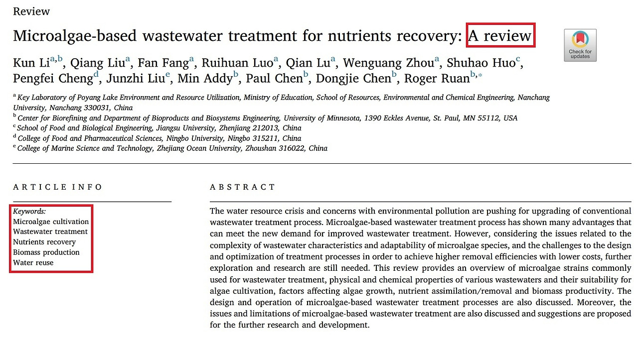 미세조류로 하수처리 하는 논문의 키워드를 모아봤다. 미세조류 (microalgae), 처리 (treatment), wastewater treatment, nutrients가 반복적으로 나온다. 내가 연구에서 반복적으로 나오는 단어를 기억해야 한다. 쓰는 사람이 검색이 잘되길 바라는 마음으로 선정한 단어다. 나와 비슷한 논문을 쓰는 사람도 그 고민에 따라 키워드를 선정했을 테다.