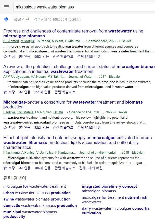 미세조류로 하수를 처리하는 검색을 하면, 반복적으로 나오는 단어가 있다. dairy. 축산 폐수에 대한 이야기다. 또, 함께 딸려오는 단어는 industrial이다. 이 둘은 제외하고 싶다면 '-'로 지정하면 된다. 또, 반드시 들어가야 하는 wastewater treatment는 반드시 포함되어야 하니, ""로 포함시킨다. 거대한 논문 바다에서 연산자를 사용하는 일은 무척 효과적이다. 여러 방법으로 내게 쥐어진 키워드를 연산자로 조합해 찾아보자.