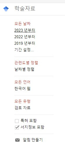 구글 학술검색 좌측에 보면 내가 사용할 수 있는 필터가 있다. 날짜가 있다. 최신 논문을 찾고 싶거나, 특정 기간을 한정하여 검색할 때 도움이 되는 기능이다.