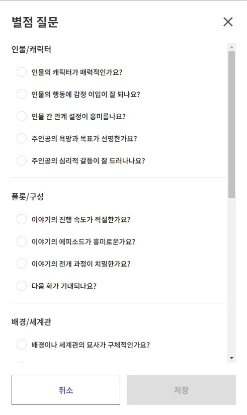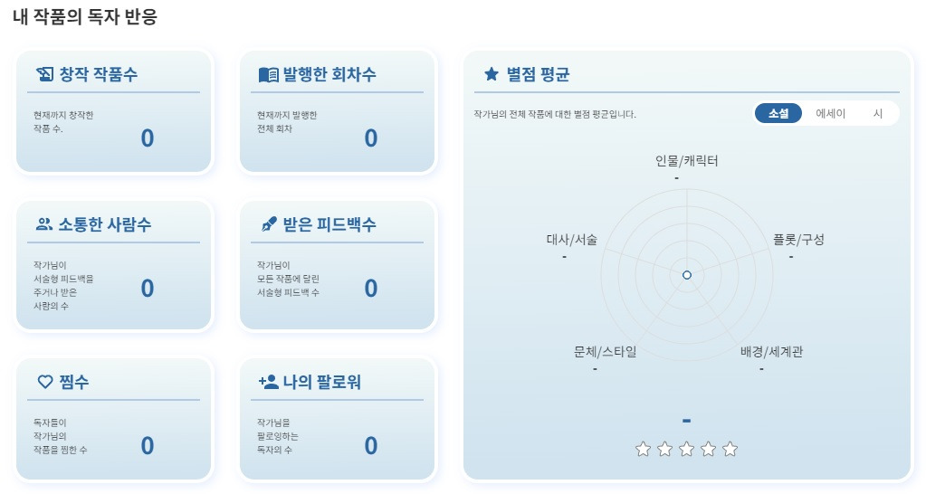 다음은 별점질문과 창작 리포트다. 숫자로 분석하기를 좋아하는 탓일까? 정말 매력적으로 보였다. 내 글을 보고 읽어주시는 분들이 캐릭터는 어떤지, 플롯은 어떤지, 배경은 어떤지 체크와 별점을 줄 수 있다. 결과를 리포트로 보고 내가 어디가 부족한지 짐작하고, 다음 작품에 적용할 수 있다는 장점이 있다. 말로 해주는 정성적인 피드백과 숫자로 보이는 정량적인 피드백을 모두 알 수 있다. 거기다, 글쓰기 어려운 분들을 위한 1:1 멘토링 서비스도 제공하고 있다.