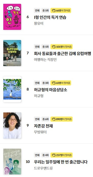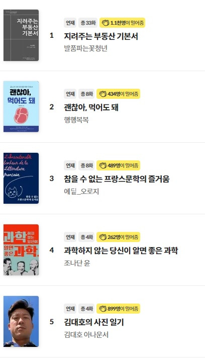 월간 TOP 10을 살펴볼까? 1등은 당당히 부동산이다. 분류를 해보면 경제경영 1편, 자기 계발 1편, 인문 2편, 과학 1편, 에세이 5편이다. 아쉽게도 소설은 한 편도 없다. 이번주 인기 작품으로 가면 밀어주기를 받은 순서대로 정렬되어 있고, 새로 고침을 하면 이제 성장하는 소설을 볼 수 도 있다.