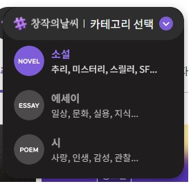 특별한 점이 두 가지 있다. 하나는 카테고리가 나눠져 있다. 소설, 에세이, 시. 원하는 분야를 볼 수 있다. 우선 누군가 소설 카테고리로 들어왔다면, 오직 그 분야만을 읽으러 들어오신 분들이라 할 수 있다. 관심을 가지고 들어왔으니, 진지하게 해당 카테고리를 진지하게 읽을 가능성이 높다.