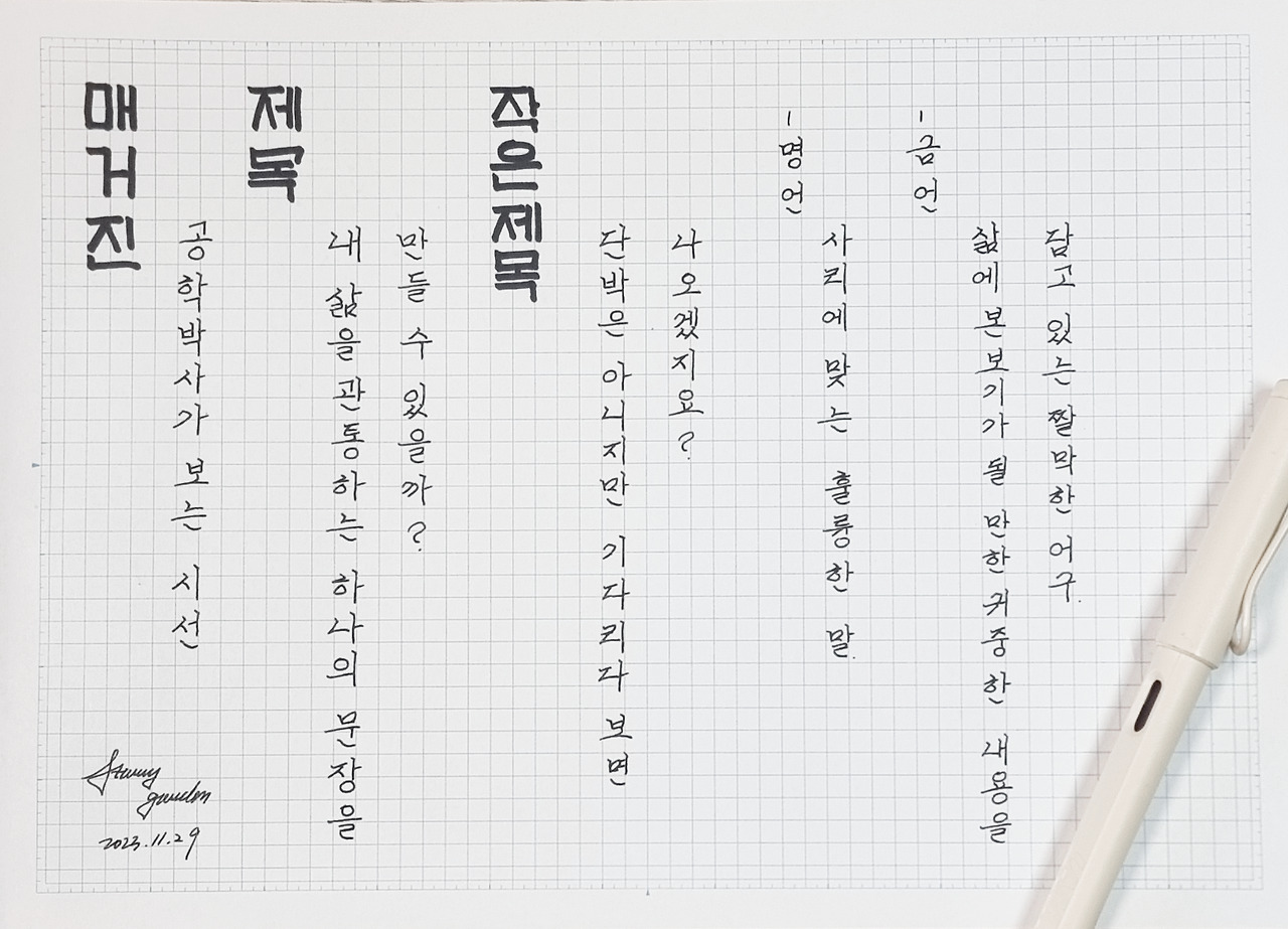 글을 쓰고 자주 하는 일이 여럿 있지만, 당장 떠오르는 건 두 가지다. 하나는 사전을 펴는 일이고, 다른 하나는 작가님들이 써놓은 글을 읽는 일이다. 단어와 문장을 수집하는 일이 된다. 모아 두고 나면, 서로 다른 이름표를 붙이고 내 노트에 정리가 된다. 명언, 금언, 잠언, 격언이다. 써놓고 보니, 세 가지의 다른 점을 찾으려 또 사전을 펼쳤다.