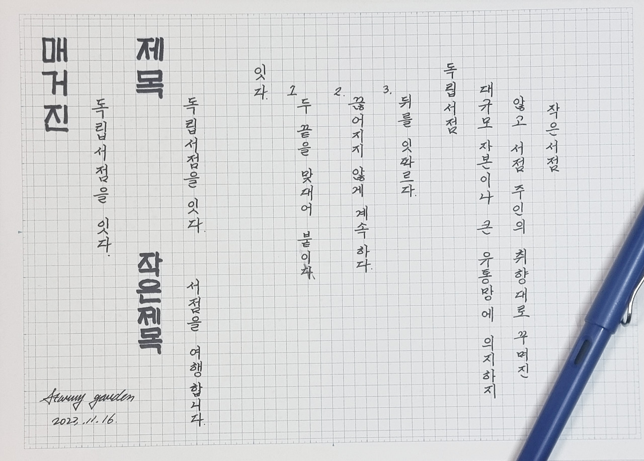귀한 서점과 나를 잇고 싶었다. '잇다. 잇다.'를 속으로 되뇌고 나니 뜻이 보인다. 묘하다.