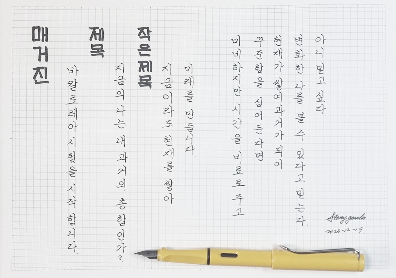 출발선은 내 의지, 내 선택과는 상관없지만, 현재 나를 만들어낸다. 내 선택과는 관계없는 과거가 내 총합이 된다. 존재의 시작은 내가 선택하지 않았지만, 겹쳐져 만들어졌다. 그러면 앞으로의 나는 아무런 의미가 없는 것일까? 단연코 아니라고 본다. 미비하지만, 시간을 비료로 주고, 꾸준함을 심어둔다면 현재가 쌓여 과거가 되어 변화한 나를 볼 수 있다고 믿는다. 아니 믿고 싶다.