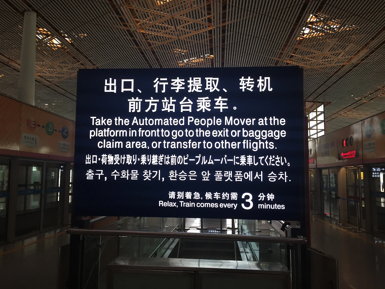 한층 내려가니 우리를 맞이한건 전광판이였다. Relax, Train comes every 3 minutes. 방금 트램을 놓치고 발을 동동 구를 승객들을 위한 너무 다정한 안내문이였다. 하지만 저기 쓰여있는 “풀랫품”은 엄마 품도 아니고 정말이지 어딘지 아직도 너무 궁굼하다.