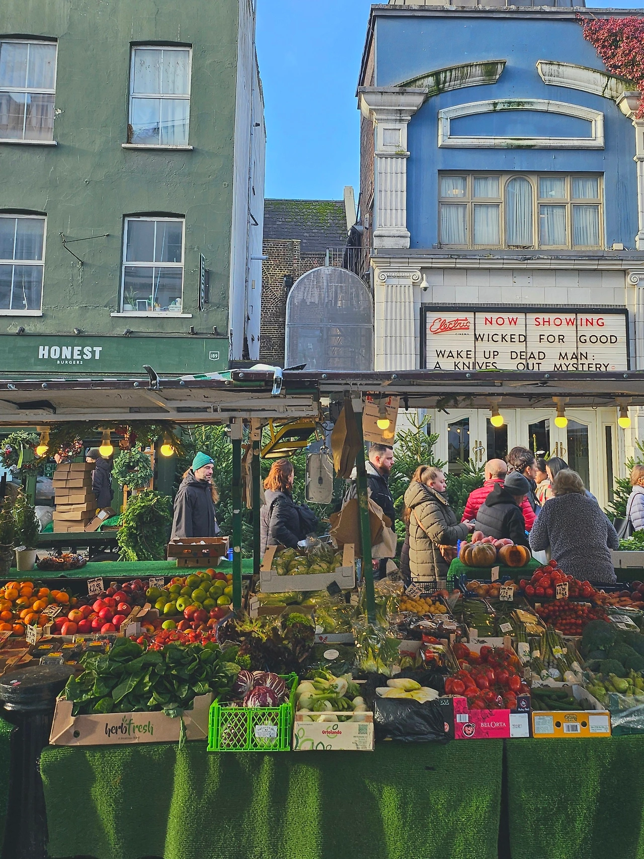 영화 노팅힐에서 윌리엄(휴 그랜트)은 안나(줄리아 로버츠)와의 관계가 틀어지고 난 뒤 혼자 이 시장을 걸어간다. 1분 30초가 넘는 롱테이크 장면동안 주인공의 허전한 마음과 대비되도록 활기차고 다채로운 시장의 모습을 시간의 흐름 속에 보여준다. 카메라는 윌리엄의 걸음을 따라가며 여름으로 시작해 낙엽이 날리는 가을, 눈이 쌓인 겨울, 화사한 봄까지 사계절을 차례로 보여준다. 시장 역시 계절에 따라 자연스럽게 진열상품이 달라지며 생동감 넘치는 분위기를 연출한다. 여름에는 싱그러운 과일과 제철채소가 거리를 풍성하게 채운다. 가을에는 어두운 스카프와 우산이 비 내리는 풍경을 완성하고 겨울에는 빨간 포인세티아와 크리스마스트리로 시즌을 알린다. 그리고 알록달록한 꽃들과 생기 넘치는 사람들의 표정 속에서 봄이 찾아온다. 초반에 등장한 임산부가 봄이 되자 아기를 안고 다시 나타나는 장면도 이 흐름에 작은 재미를 더한다. 시간은 이렇듯 일상을 따라 흘러가지만 주인공의 감정은 여전히 한자리에 멈춰 있는 듯하다.