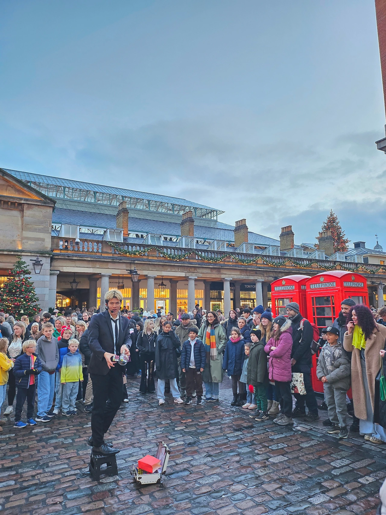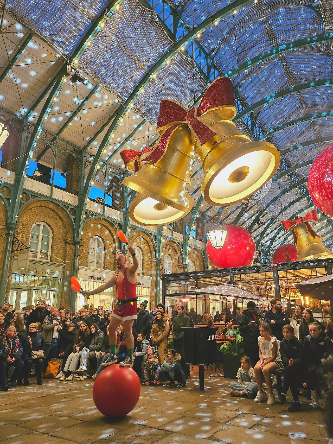 안쪽 광장에서는 화려한 크리스마스 장식을 배경으로 거리의 예술가들이 각자 준비한 무대를 펼치고 있었다. 그림을 그리는 사람도 있었고 노래를 부르며 악기를 연주하거나 마술을 선보이기도 했다. 우리는 두 명의 남자가 진행하는 코미디 쇼를 보기 위해 자리를 잡고 앉았다.