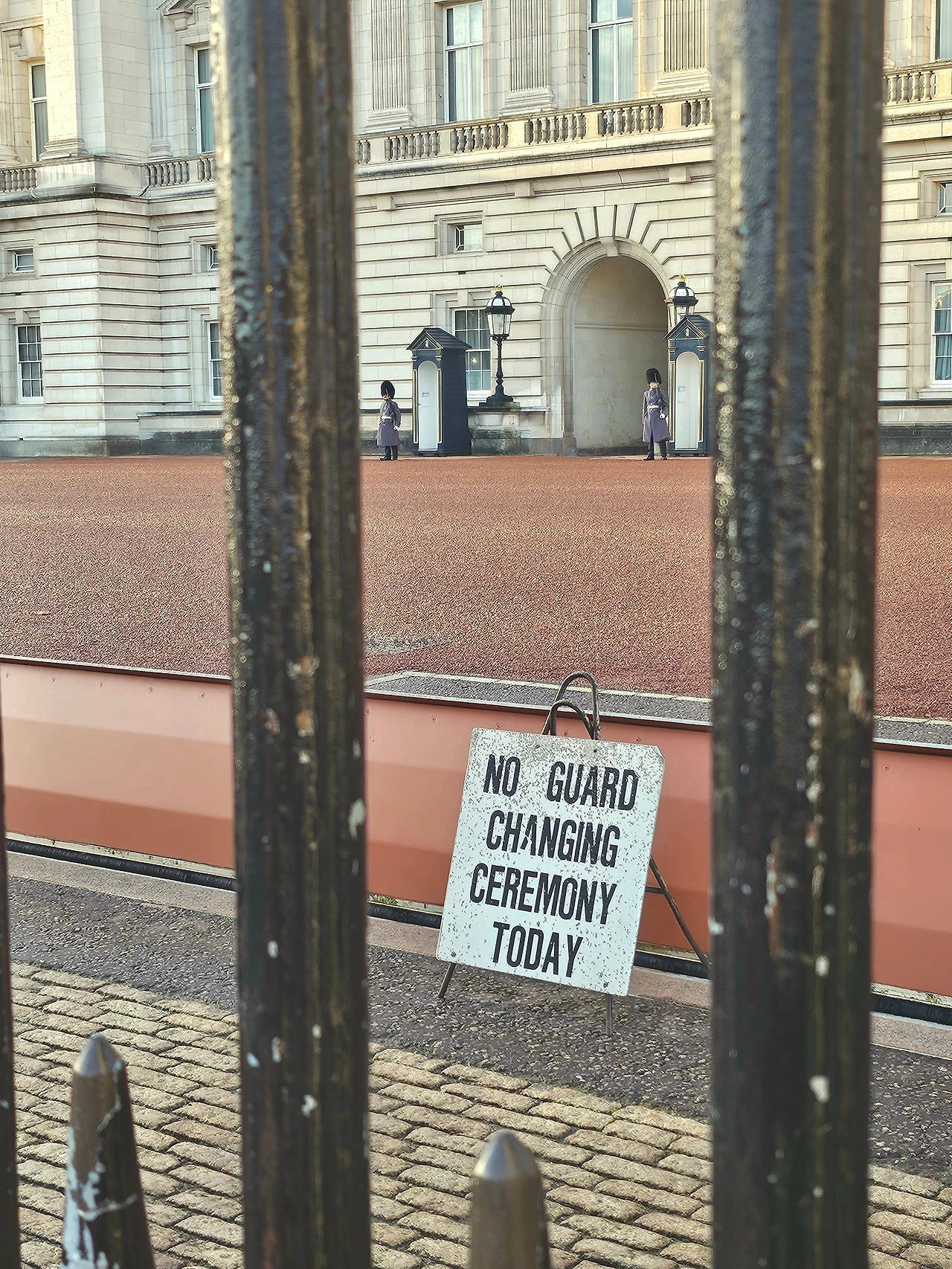 명당을 사수하기 위하여 교대식 한 시간 전부터 몰려든 각국의 여행객들 사이로 일제히 "하아" 하는 탄식이 들려왔다. 궁전 안쪽이 보일 만큼 가까이 가보니 오늘은 근위병 교대식이 있는 요일인데도 불구하고 하지 않는다는 팻말이 있었다. 궁전이 누구 것인지 몰라도 참 단호하다. '사정상'이라는 단어라도 넣어주지 말이다. 유튜브로 예습하고 온 여행자가 분명 있었을 텐데.