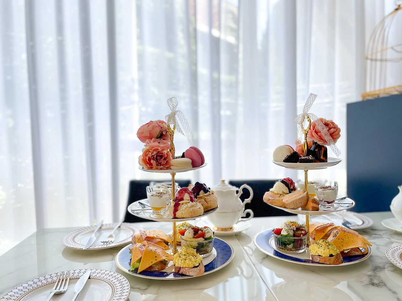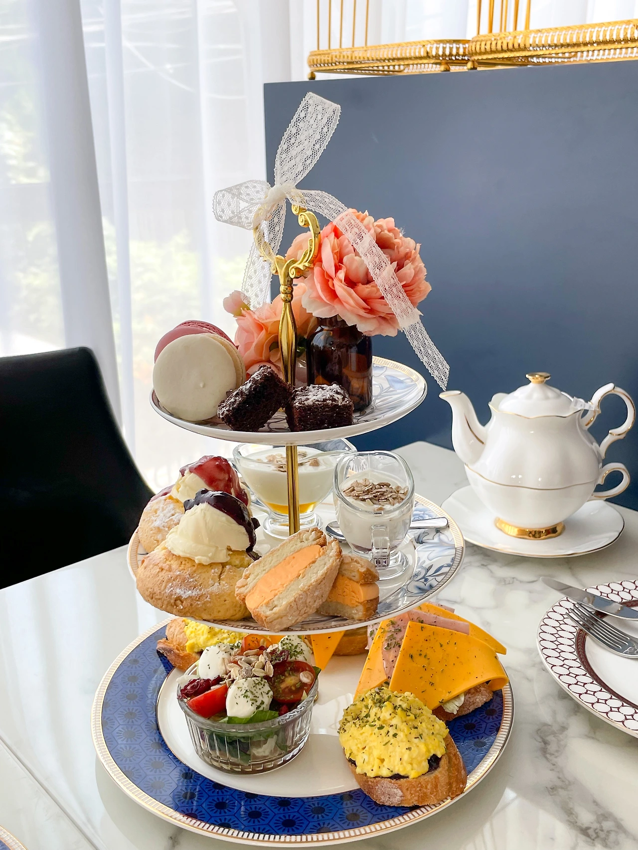 고풍스러운 접시에 예쁜 조화와 리본이 장식된 3층 트레이에는 층별로 다른 디저트가 있었다. 1층에는 오픈 샌드위치와 샐러드가. 2층에는 다쿠아즈와 스콘, 요거트가. 3층에는 브라우니와 마카롱이 자리했다. 가벼운 다과세트보다는 한 끼를 넉넉히 채우는 브런치 느낌에 가까웠다.