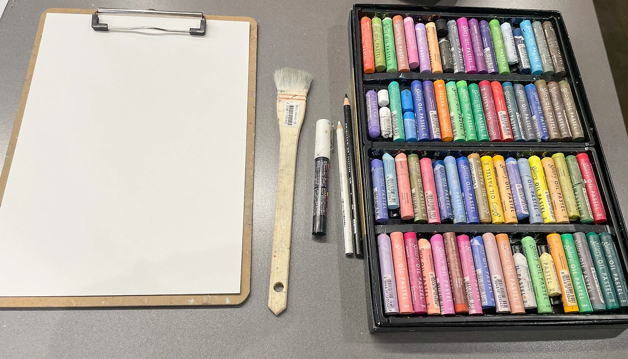 작은 회의실 느낌이 나는 공방에 도착하고 가장 먼저 마주한 것은 정갈하게 세팅된 재료들이다. 연습용 종이, 브러시, 마카와 색연필 그리고 대망의 주인공인 '오일 파스텔'.
