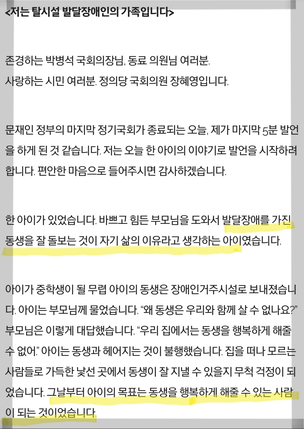 안녕하세요 장혜영 국회의원님. 저는 국회의원님과 같이 발달장애인 동생을 돌보는 누나입니다. 의원님. 저는 저와 같은 상황에서 국회의원까지 지내시는 의원님이 뭔가 친밀하고 존경스러웠습니다.