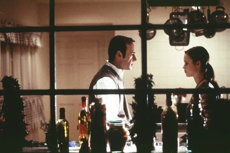 특히 레스터 번햄(케빈 스페이시)가 딸의 친구 안젤라(미나 수바리)를 응시하는 많은 장면이 인상적입니다. 카메라는 레스터 번햄의 욕망(향해선 안 되는 곳을 바라보라 부추기는) 적나라하게 보여주죠. 재미있게도 딸 제인(도라 버치)은 안젤라를 향한 아버지의 끈적끈적한 욕망을 느끼지만, 그의 아내 캐롤린(아네트 베닝)은 옆에서도 그 시선의 정체를 모릅니다. 이는 안젤라를 향한 제인의 질투를 보여주며(혹은 엘렉트라 콤플렉스를), 동시에 아내의 욕망이 향하는 곳이 남편이 아님을 알게 하죠.
