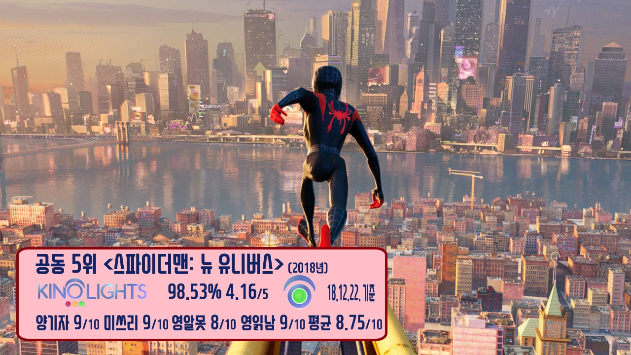 공동 5위는 '마블 스파이더맨 세계관'의 총집합체인 '스파이더버스'를 다루고, 평행세계를 스크린에 구현한 애니메이션 <스파이더맨: 뉴 유니버스>입니다. "누구든지 '스파이더맨'이 될 수 있다"는 신선한 주제를 담고, 여러 종류의 스파이더맨들을 한 작품에서 모두 만나볼 수 있다는 독특한 스토리는 물론, 역동적이고 스타일리시한 비주얼이 돋보이죠. 영화의 모든 장면이 컴퓨터 그래픽으로 만든 이미지 위에 직접 손으로 그린 그림으로 마무리되는 등 마블 코믹스 원작의 클래식한 느낌으로 완벽히 구현됐으며, 카메라 포커스를 조정하여 이미지를 의도적으로 깨지게 만드는 등 섬세한 연출이 인상적이었네요.