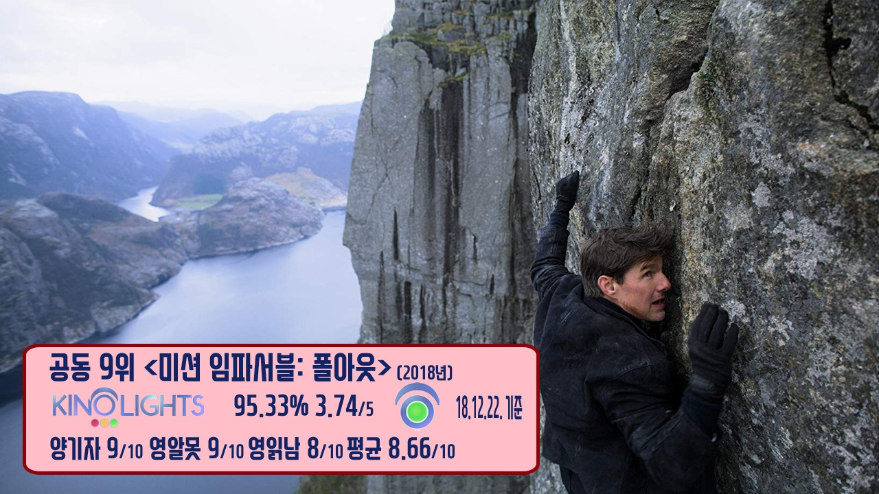 공동 9위는 스파이 요원 '에단 헌트'(톰 크루즈)와 'IMF'팀이 행한 모든 선의의 선택이 최악의 결과로 돌아오면서 피할 수 없는 미션을 끝내야만 한다는 <미션 임파서블: 폴아웃>입니다. 관객의 입장에선 톰 크루즈의 액션이 CG를 지양한 진짜 액션임을 알기에 더 큰 스릴을 느낄 수 있는데요. 극 영화이지만 다큐멘터리식 긴장감을 느끼게 하는 매력은 '미션 임파서블 시리즈'의 특수함이 됐죠. 그 어떤 배우도 직접 시도하지 않았던 헤일로 점프와 헬기 조종을 해내는 톰 크루즈의 모습을 통해 시각적 스펙터클을 전시하고 완성했는데, 혹여나 아카데미 시상식에 스턴트 부문이 있다면, 이 작품이 받지 않았을까요?