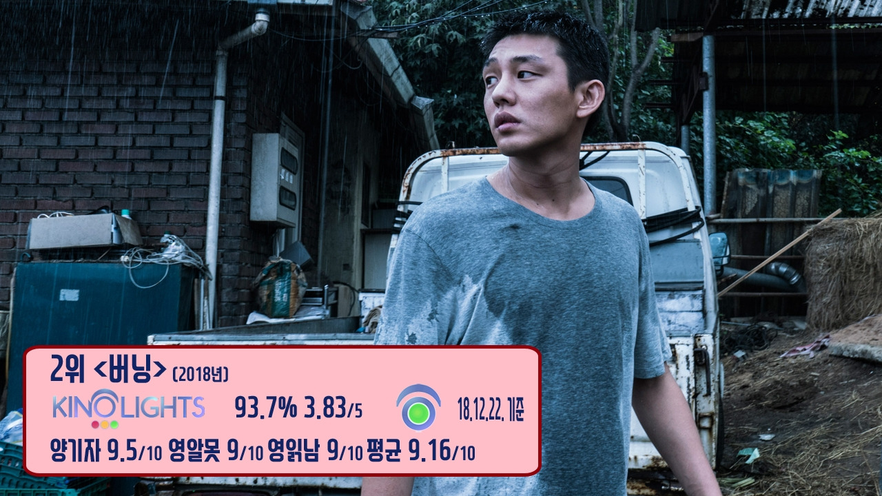 2위는 유통회사 아르바이트생 '종수'(유아인)가 어릴 적 동네 친구 '해미'(전종서)를 만나고, '해미'에게 정체불명의 남자 '벤'(스티븐 연)을 소개받으면서 벌어지는 비밀스럽고도 강렬한 이야기 <버닝>입니다. 이창동 감독이 8년 만에 돌아온 작품으로, 칸 영화제에서 벌칸상과 국제비평가협회상을 받았으며, 한국영화 사상 처음으로 아카데미 시상식 외국어영화상 1차 후보에 이름을 올렸죠. 미스터리 스릴러이지만, 그 안을 파고들면 우리 사회 전반에 깔린 메시지로 가득했고, 그 메시지는 '분노'로 연결됐는데요. 차갑지만, 뜨거운 무언가가 타오르는 영화로,관객에게 여러 해석을 하도록 만들어졌습니다.