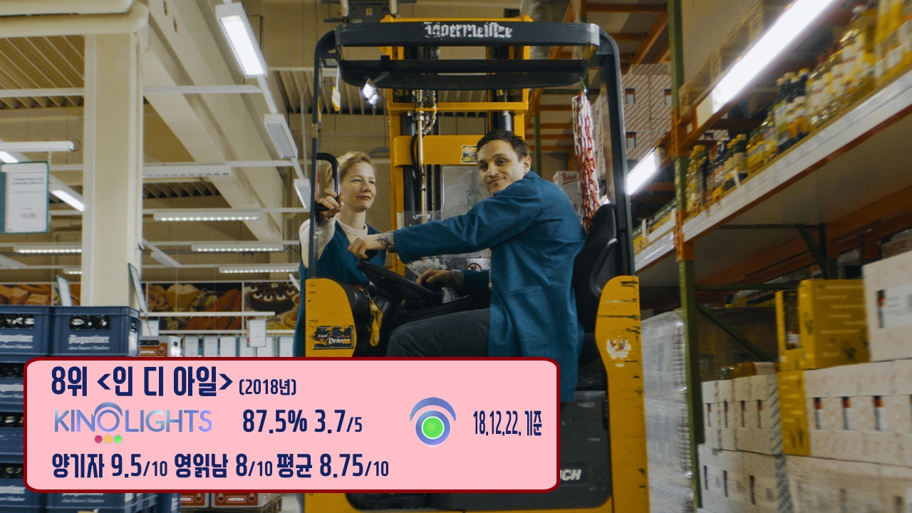 8위는 슈퍼마켓에서 일하는 청년 '크리스티안'(프란츠 로고스키)이 겪는 이야기, <인 디 아일>입니다. 일상에서 접할 수 있는 내용을 이용해 사회적 현상을 설명하는 것과 동시에 철학적인 내용도 함유한 독일 영화였죠. 통일된 독일에서는 아직도 서독과 동독의 갈등이 남아 있는데, '크리스티안'은 혼자 사는 동독 출신으로, 내성적이면서 사회적으로 무기력함을 느끼는 인물로 묘사됩니다. 그러한 상황에서 젊은 시절 트럭으로 동독을 누볐지만, 어느덧 '자본주의'의 상징인 슈퍼마켓에서 지게차 운전을 하는 선배이자 멘토 '브루노'(피터 쿠스)가 다음 통일 독일 세대 '크리스티안'의 적응을 도와준다는 내용입니다.