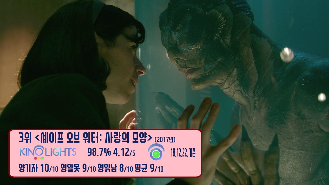 3위는 기예르모 델 토로 감독이 태어난 1964년 무렵을 배경으로 하며, 자신의 유년 과정에서 겪은 경험을 고스란히 스크린으로 옮겨낸 <셰이프 오브 워터: 사랑의 모양>입니다. 제목 그대로, 특정한 형태가 없는 물처럼 다양한 표현법을 담아내고 있는 작품이었죠. 인간과 괴생명체의 사랑이라는 이야기와 더불어, 흑인과 여성, 성소수자의 차별이 있던 1960년대를 다시 꺼내면서, 트럼프 대통령 시대에 약자에 대한 태도가 변한 것 같지만, 근본적인 변화는 이뤄지지 않았다는 것을 비판했는데요. 이러한 영향 덕분에, 이 작품은 아카데미 시상식에서 13개 부문 후보에 올라, 작품상, 감독상, 미술상, 음악상을 받았습니다.