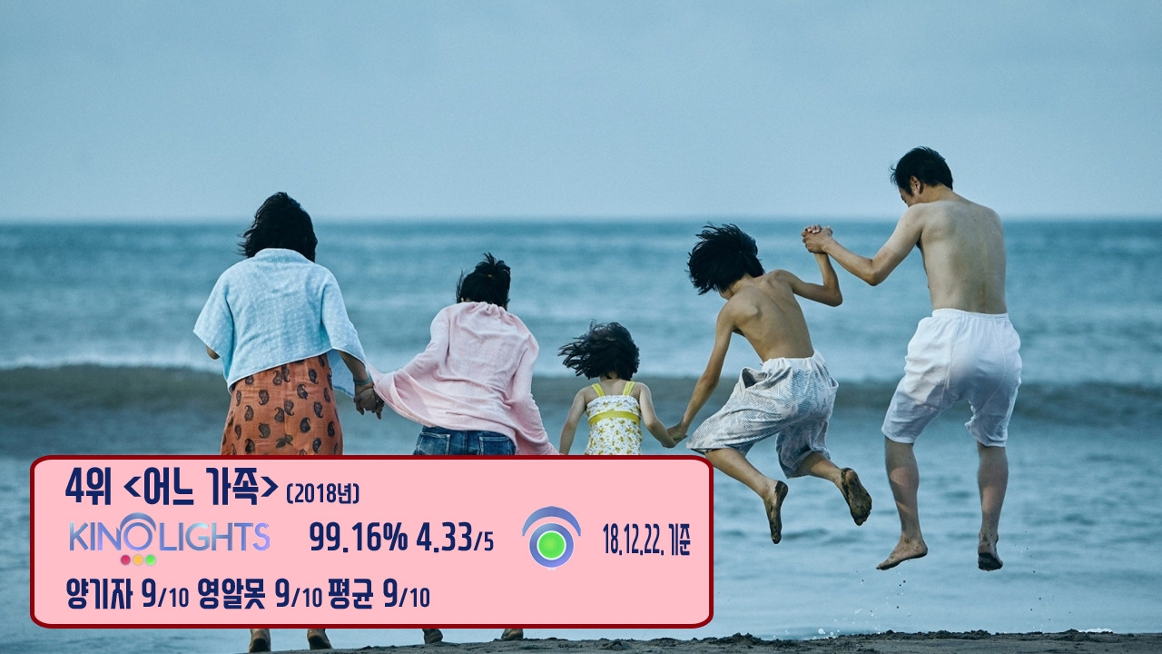 4위는 칸 영화제 황금종려상을 받은 고레에다 히로카즈 감독의 <어느 가족>입니다. 이 작품의 본래 제목은 '만비키 가족'으로, 여기서 '만비키'(万引き)는 '물건을 사는 척하면서 훔치는 사람들'을 뜻하죠. 고레에다 히로카즈 작품들이 그러한 것처럼, 이 작품은 가족들의 이야기를 따라가면서, 동시에 사회에서 벌어지는 문제를 정확히 꿰뚫었습니다. 그래서일까요? 일본 우익 세력은 "일본의 수치를 보여준 작품이 상을 받는 것에 침묵하는 행위가 '국가의 품격'을 보여준다"는 평을 내리기도 했죠. 한편, <어느 가족>은 고레에다 히로카즈 감독이 그의 '페르소나', 키키 키린과 함께한 마지막 작품이 되고 말았습니다. (2018년 9월 별세)