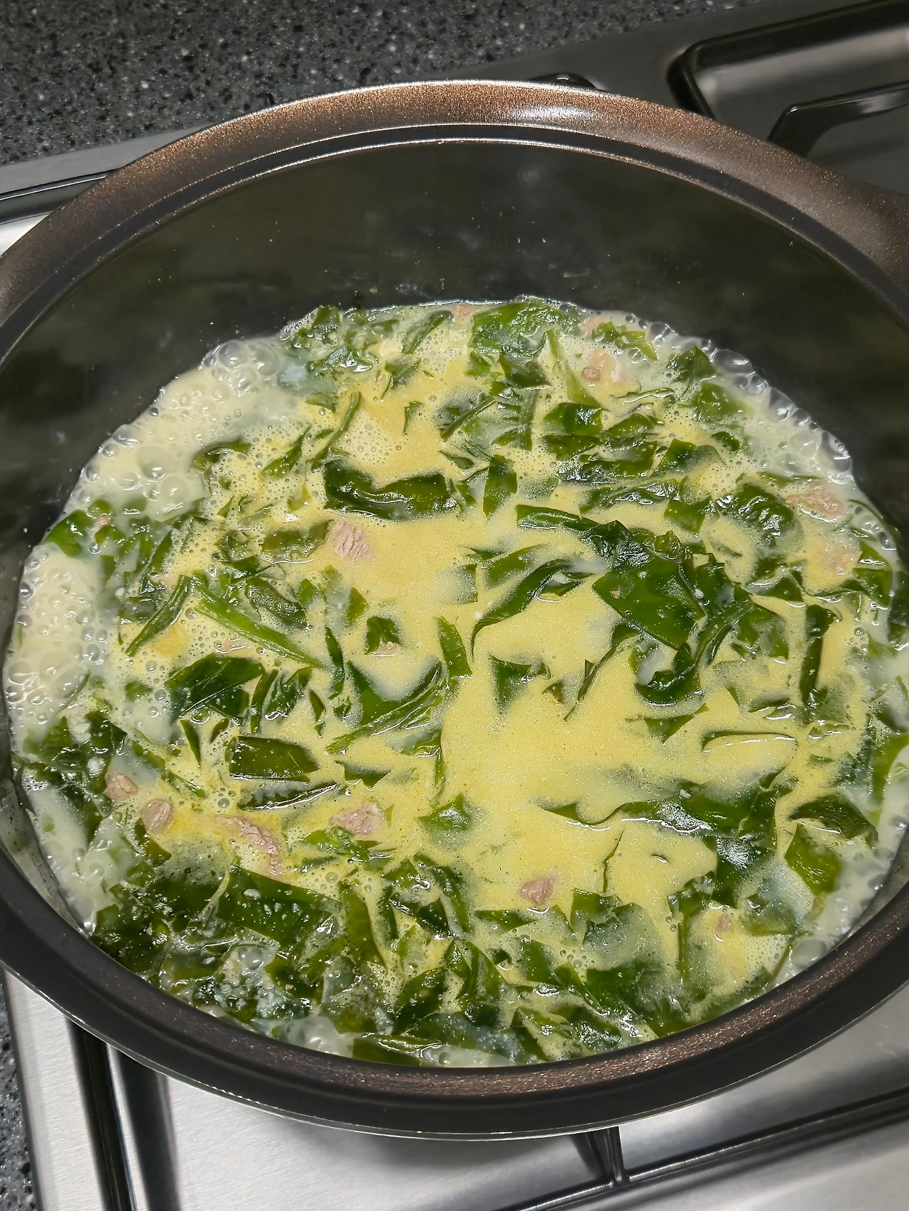 열심히 볶은 재료들과 뿌연 사골육수가 만나니 이때부터 맛있지 않을까 싶었다. 사골육수를 넣어 미역국을 만드는 건 처음이었다 보니 깊은 맛에 대한 기대 하나로 간을 봤다. 그런데 사골육수 맛도 안 나고 그냥 밍밍한 미역탕(?) 맛이 나더라. 계량 없이 시작한 요리지만 짠맛이 부족한 것 같아 국간장을 몇 바퀴 돌리고 소금도 몇 번 털어 넣는 후보정 작업을 거쳤다. 사골육수에 국간장, 들기름이 들어가니 색은 요상해도 점점 맛을 찾아가기 시작했고, 수없이 간을 본 결과 가스레인지의 불을 끌 수 있었다.