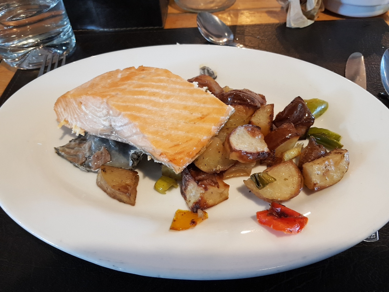 김치찌개? 같은 싱거운 맛인 수프와 마늘 바게트 빵, 연어스테이크 그리고 파인애플 아이스크림, 이름 모를 디저트를 정말 맛있게 먹었다.