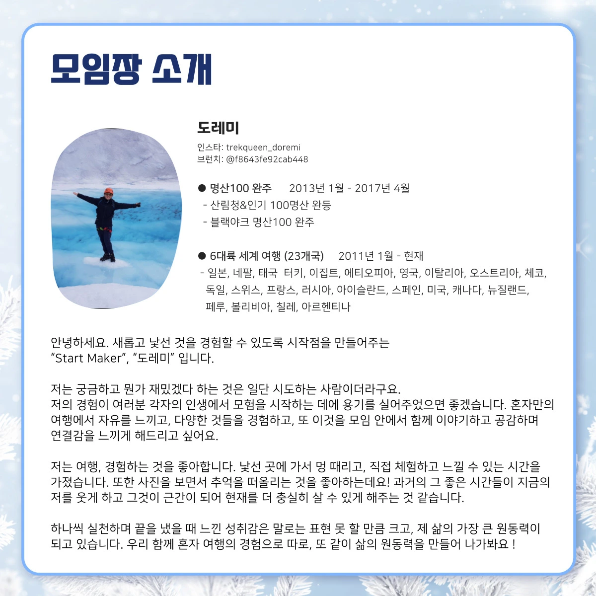 Start Maker_도레미 *6대륙 여행자 *명산100완주자 궁금 하면 일단 시도 하는 사람 입니다! 저의 경험이 각자의 인생 모험을 시작하는데 용기를 실어드리고 싶습니다!♥︎