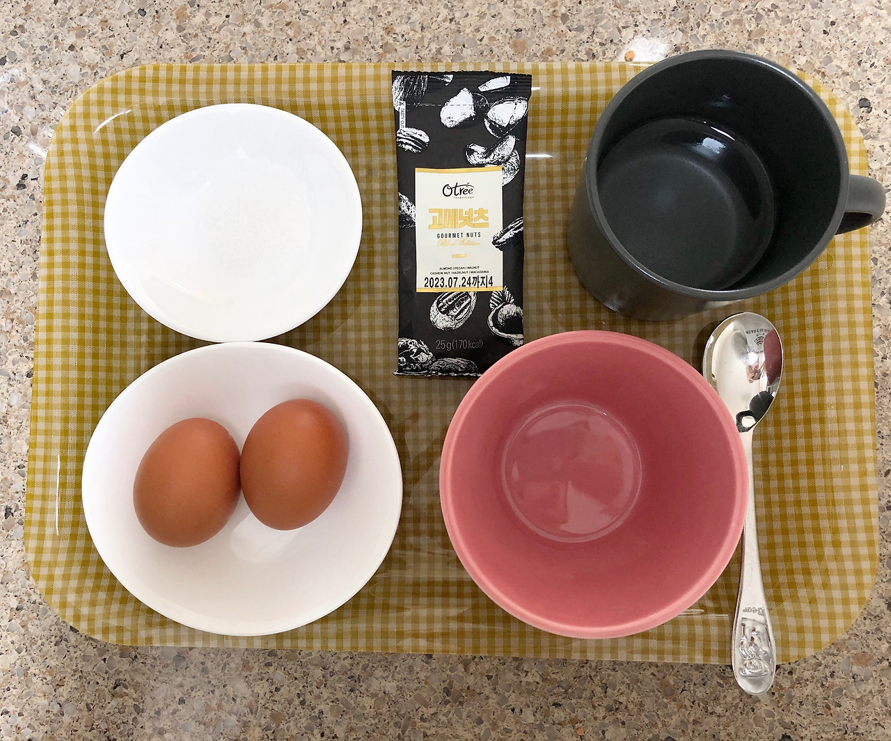 집안일을 정돈하고 마무리할 때쯤 고이 차려진 한상이 눈에 띈다. 남편이 미리 준비해둔 삶은 계란과 소금 그리고 견과류. 그가 매일 아침 먹는 아침 루틴이다. 이른 새벽에 출근하니 신경 써주지 못해 미안한 마음도 있지만 늘 똑같이 미리 아침 준비를 해두는 모습을 보면 참 존경스럽다.