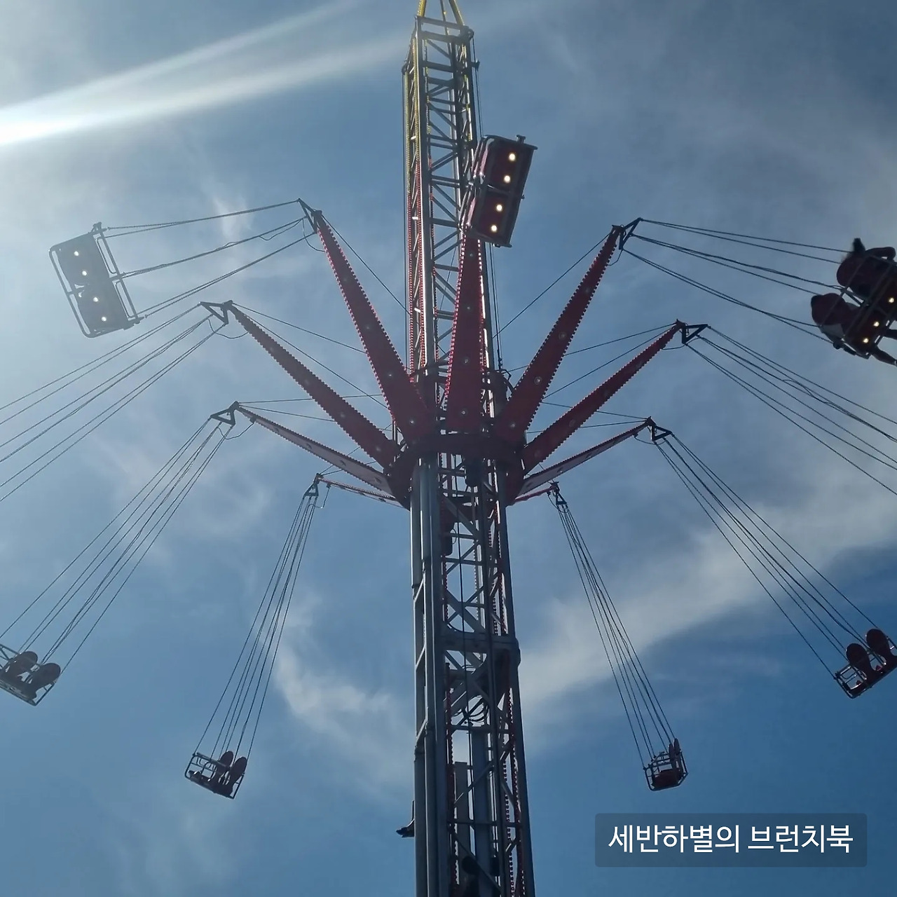 조금 더 걸어 내려오면 이번에는 관람차, 하늘을 나는 기계들이 한가득이다. 아이들은 줄을 서고 다음 기계로 뛰어가는 쳇바퀴를 반복한다. 밑에서 바라보는 내 목이 뻐근히 아픈 지경이 되어서야 이제 그만 타고 싶다고들 한다. 다행이다. 더는 인출해 온 현금이 남아 있지 않은 참이었다.