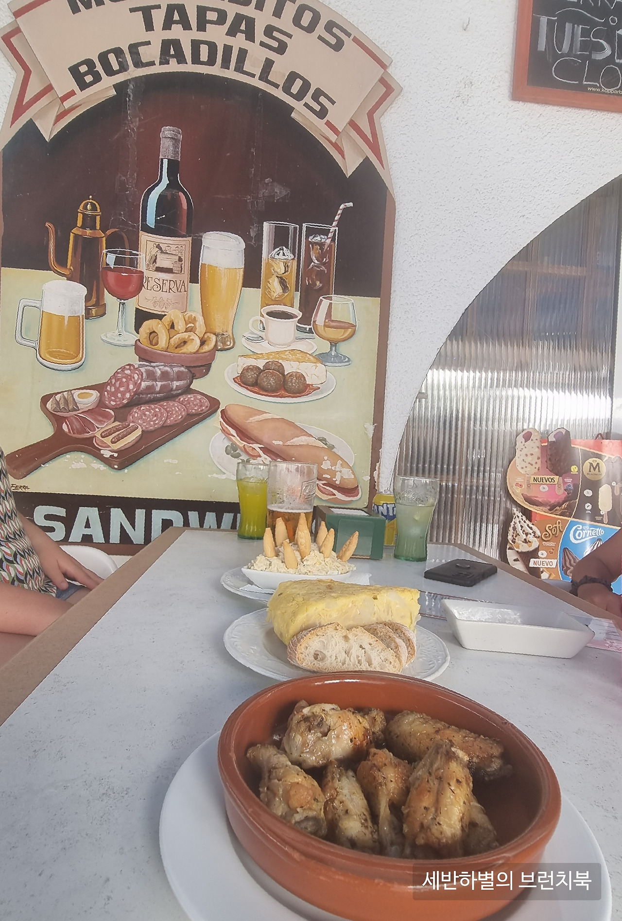 어쩐다. 역시 언제나 방법은 찾으면 나온다. 바 옆 조그만 진열장에 간식류가 보인다. 삶은 감자를 계란말이에 넣어 한국식 그것보다 더 두툼한 스페니쉬 오믈렛이 있고, 닭봉 튀김도 있다. 그 옆에 다른 메뉴가 하나 더 있다 . 꼭 감자샐러드 같은데 다른 사람에게 서빙되는 모습을 보니, 생선 냄새도 나는 것 같고 평소 보던 그 감자샐러드가 아니다.