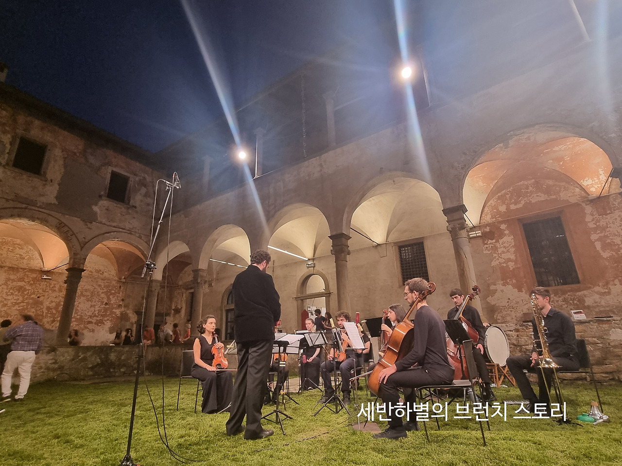 낮 시간의 열기는 가라앉았지만 그럼에도 더운 밤이었다. 지휘자는 검은 지휘복을 차려입고 조명을 등지고 무대 중앙에 선다. 10여 명으로 구성된 작은 오케스트라단은 각자의 파트에 맞춰 정성을 다해 연주한다. 서로 눈 맞추며 박자와 리듬을 구성해 가는 모습이 그간 연습해 온 시간을 짐작케 한다. 그저 잠깐 들러 보려 온 사람들도 예상외의 진지하고 수준 높은 공연에 자리를 떠나지 못한다.