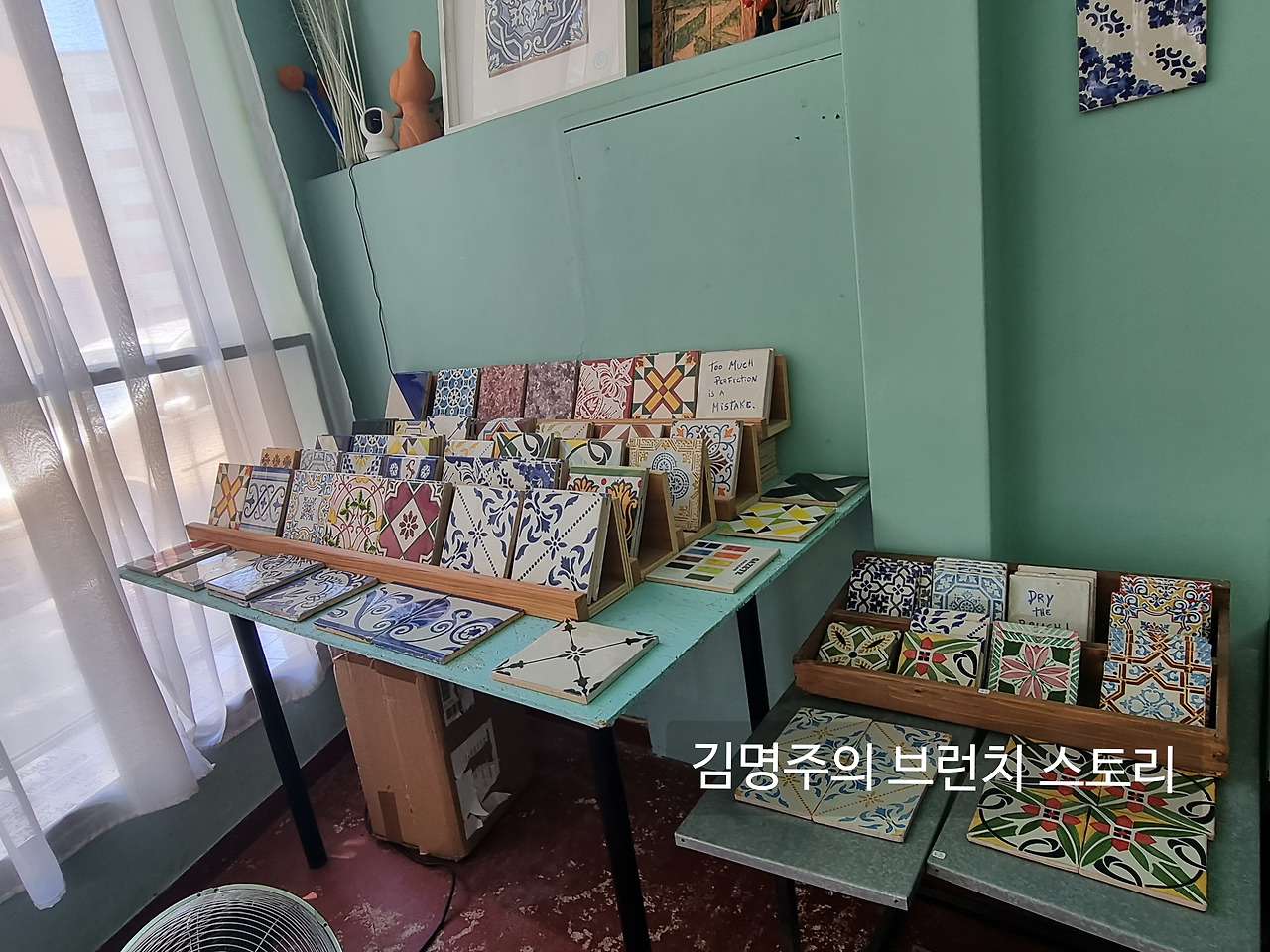 주인장은 수십여 장의 샘플 디자인 중 두 개를 고르도록 한다. 하나는 전통 아줄레주 스타일의 흰 바탕에 푸른 타일, 디자인은 전통문양 중 하나라는 양파꽃을 골랐다. 다른 하나는 따뜻한 남부 유럽을 상징하는 듯 붉은빛과 노란빛이 섞인 화려한 색감의 타일을 골랐다.