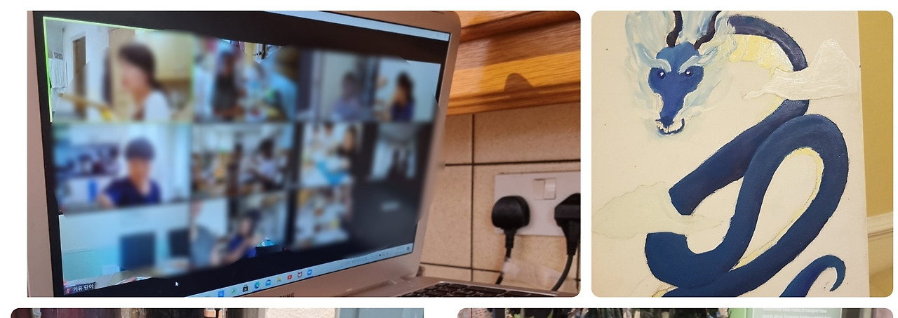 영국 지역별로 한글학교가 운영 중에 있다. 금요일 저녁마다 줌으로 한국 문화에 대해 생각해 보고 재미있게 배우는 시간을 갖는다. 이번에는 산적 만들기와 붓으로 청룡 그려보기 활동을 한다. 두 아이도 한글 선생님 말씀 따라 이렇게 저렇게 따라 해본다. 아무래도 문화 체험이 부족한 딸들에게 이 또한 귀한 시간이 아닐 수 없다.