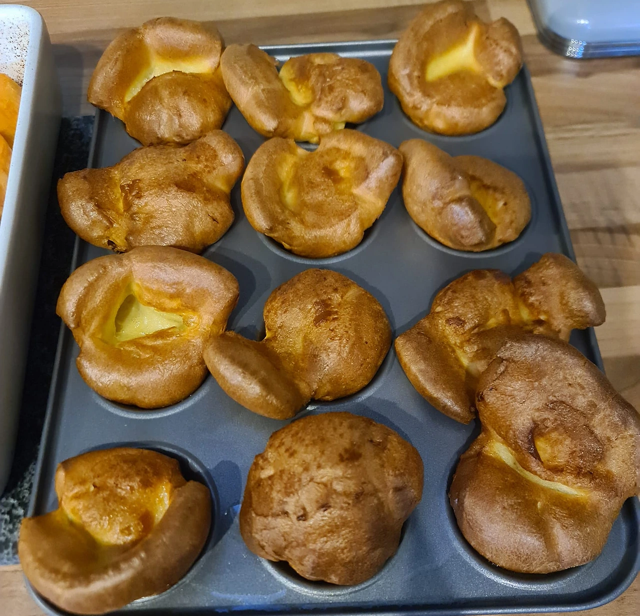 요크셔푸딩이라는 컵모양으로 생긴 빵을 집에서 굽는다. 다른 빵들처럼 반죽하고 발효되기를 기다릴 필요가 없다. 그저 요리기름을 뜨겁게 달구고 거기에 밀가루, 계란, 우유로 만든 반죽을 넣어 오븐에 구우면 완성이다. 파이 같은 폭신한 식감에 고소한 기름맛이 좋다.