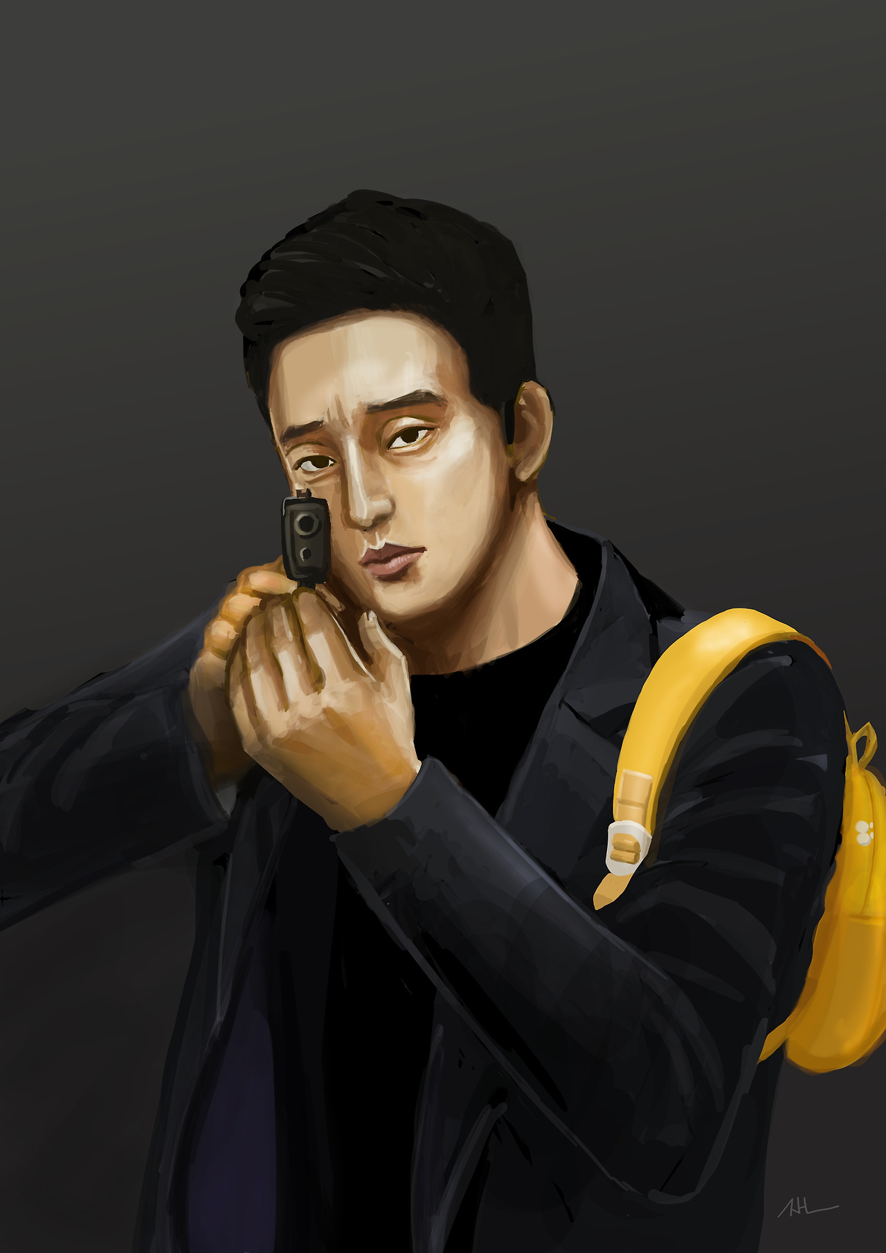 '블랙'요원이지만 아이들의 깜찍한 가방을 메야 하는 김본의 상황을 색감 대조를 통해 표현했다.