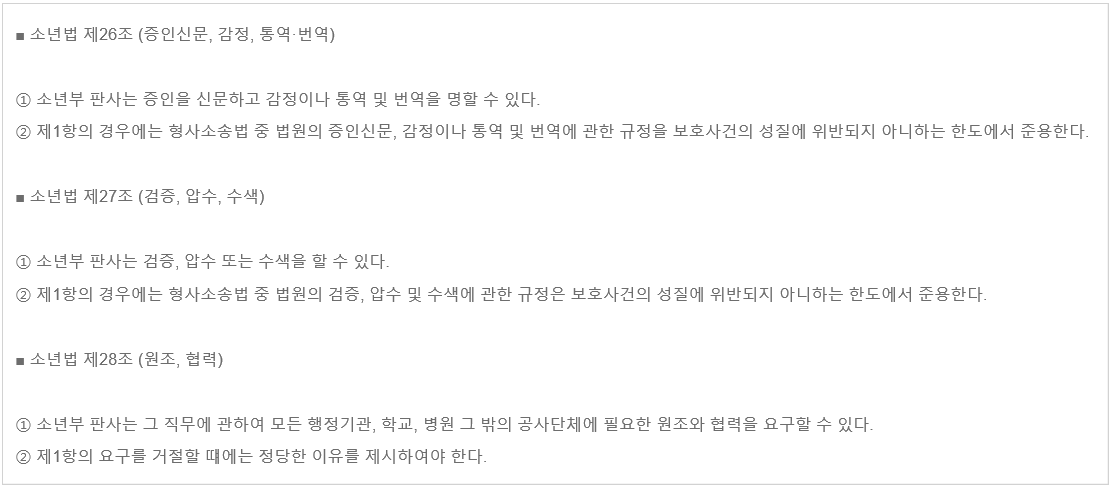 소년부 판사는 조사관으로 하여금 송치 또는 통고된 소년, 소년의 보호자 또는 참고인을 심문하게 할 수 있고, 그 밖에 필요한 사항을 조사하게 할 수 있습니다. 또한 소년부 판사는 조사 또는 심리를 할 때에 정신과의사·심리학자·사회사업가·교육자나 그 밖의 전문가에게 진단을 의뢰하여 그 의견을 참고할 수 있습니다.