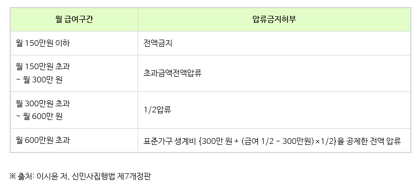 월 320만원의 급여를 받는 사람은 그 1/2인 160만원에 대하여 압류가 가능하게 되고,