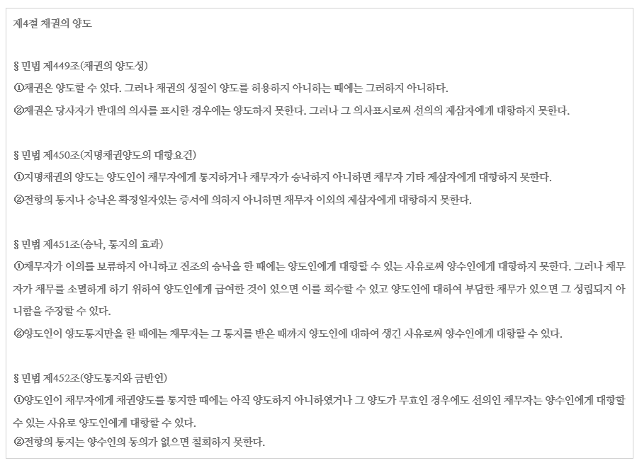 ⑧ 채권의 재산적 성격과 양도성을 제고하는 것이 국제적 흐름이라 하더라도 이는 대부분 제한적 범위 내에서 해석이 아닌 법규정을 통해 달성되고 있음에 유의하여야 한다. 그러므로 문언상 양도금지특약을 위반한 채권양도의 효력이 부인된다는 의미가 도출되는 민법 제449조 제2항에도 불구하고, 양도금지특약을 위반한 채권양도를 원칙적으로 유효하다고 보는 새로운 해석을 도입하는 데에는 신중할 필요가 있다(대법원 2019. 12. 19. 선고 2016다24284 판결).