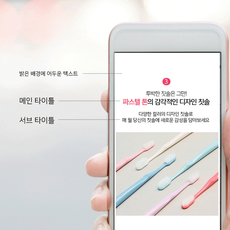 특히 최근엔 PC 쇼핑보단 모바일 쇼핑 이용자가 더 많기 때문에 모바일 환경에서 어떻게 보이느냐도 매우 중요합니다. 모바일에 최적화된 글꼴이나 디자인을 적용시키는 것도 좋지만 상품에 따라 소비자에게 다른 판매자의 상품과의 차별성을 표현하는 것이 중요합니다.