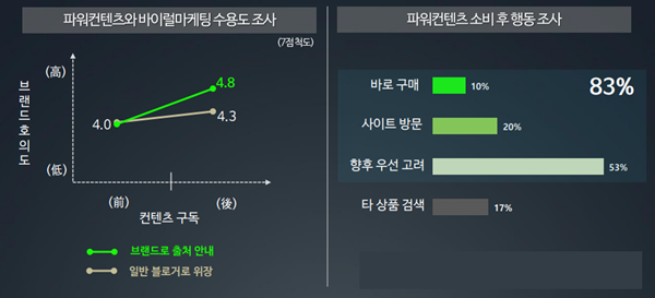 배너광고와 바이럴 마케팅에 피로도를 느낀 소비자들에게 파워콘텐츠는 광고주가 직접 소개해주는 콘텐츠에 오히려 더 긍정적으로 인식해 호감을 갖는 경우가 많습니다.