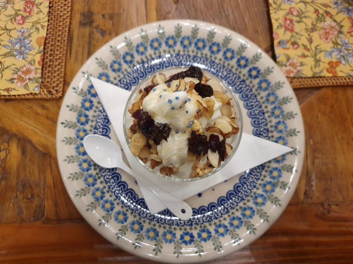 차가운 요거트에 번쩍 정신을 데이고 나니까 주변 것들도 눈에 들어오더라. 파란색 장미 문양이 이쁜 접시도 눈에 들어오고, 접시와 유리그릇 사이에 미끄러지지 말라고 깔아 둔 냅킨도 눈에 들어왔다. 스푼은 도자기로 되어있었는데, 번쩍번쩍한 하얀색의 재질감이 요거트와 굉장히 잘 어울리는 것 같았다.
