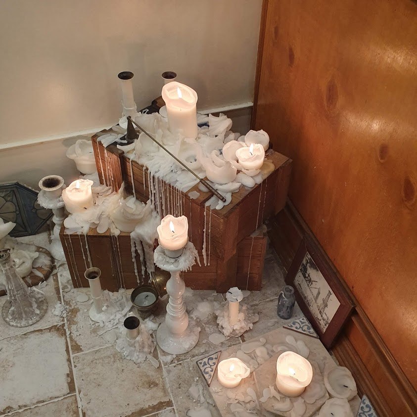 바로 등 뒤에는 촛불이 켜져 있었다. 나무 박스 위에 정돈되어있지만 정돈되지 않은 채로 녹아내리는 것이 공기에 따스함을 더한 듯했다.
