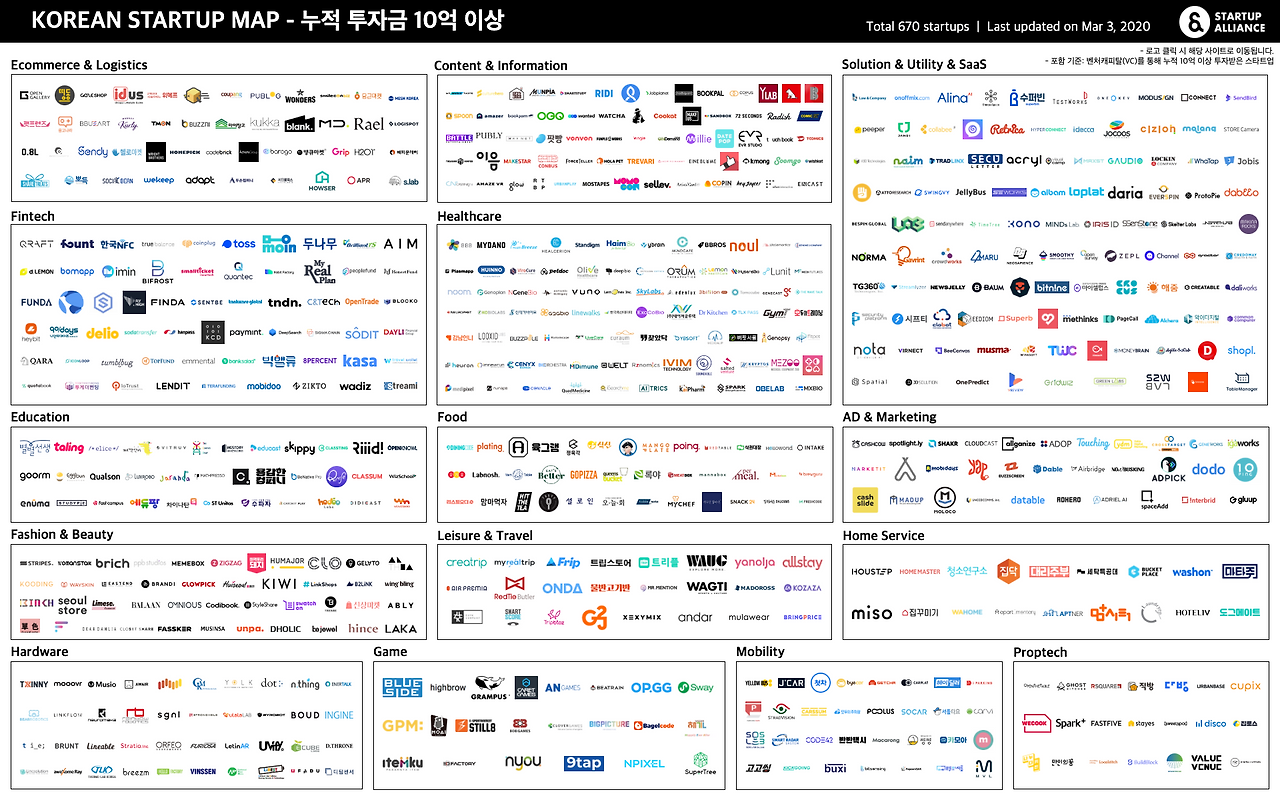 'KOREAN STARTUP MAP 누적 투자금 10억 이상'의 경우 포함 스타트업이 많아 식별에 어려움이 있습니다. 2페이지부터 카테고리별로 확대된 버전을 준비해두었으니 참고 바랍니다.
