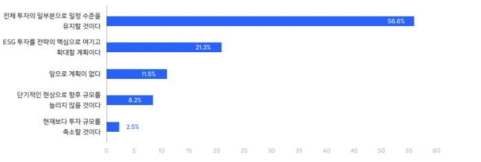 벤처캐피탈, 액셀러레이터, PE 등 투자사들 77.9%는 앞으로 ESG 투자를 유지하거나 확대하겠다고 답했는데요. 이 응답자들을 더 자세히 살펴볼까요? 절반 이상인 56.6%가 ‘일정 수준 이상 ESG 투자를 유지할 것’이라고 했는데요. 또한 21.3%는 ‘ESG 투자를 전략의 핵심으로 여기고 확대할 계획’이라며 적극적인 투자 계획을 밝히기도 했습니다.