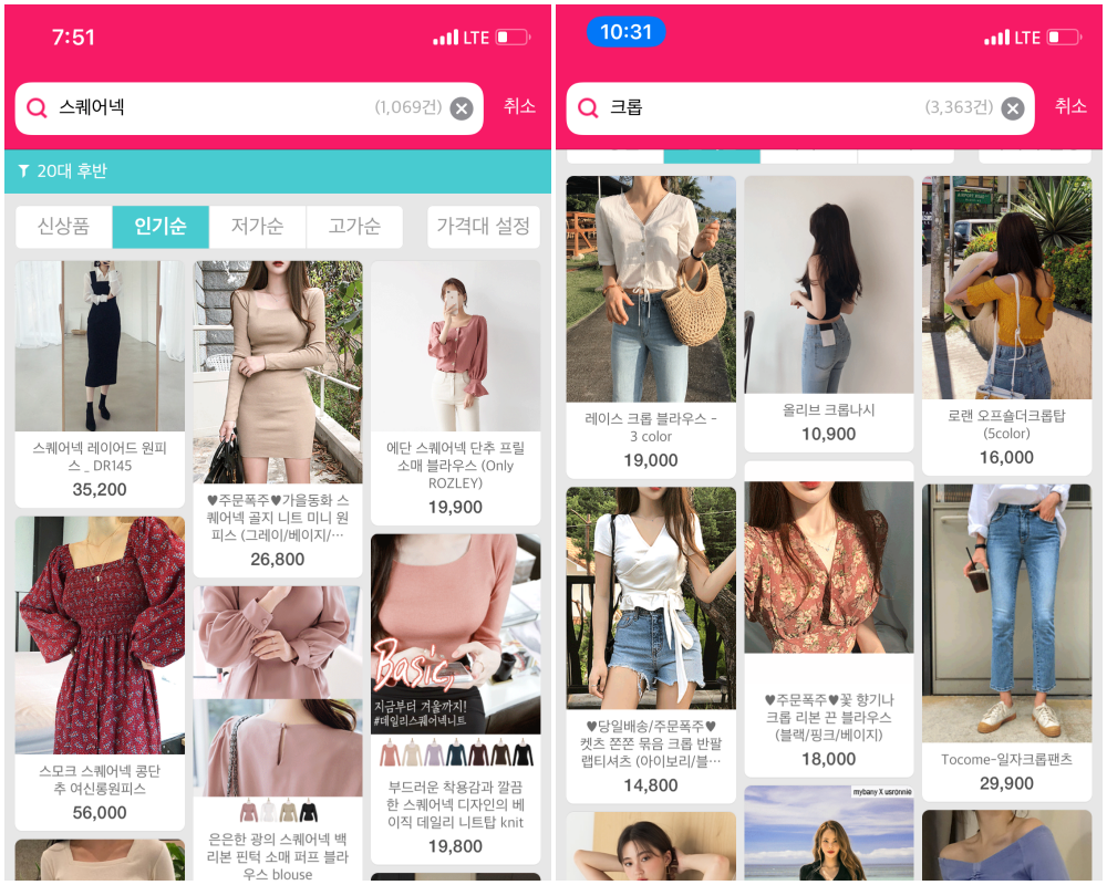 패션 시장에서 트렌드 키워드는 항상 존재합니다. 그리고 보통 여성분들은 저같이 좋아하는 아이템의 특징이 명확한 경우가 많습니다. 그렇다면 모든 쇼핑몰 내 해당 키워드를 가진 아이템을 검색할 수 있다면 어떨까요. 아래는 제가 실제로 좋아하는 키워드로 검색한 예시입니다.