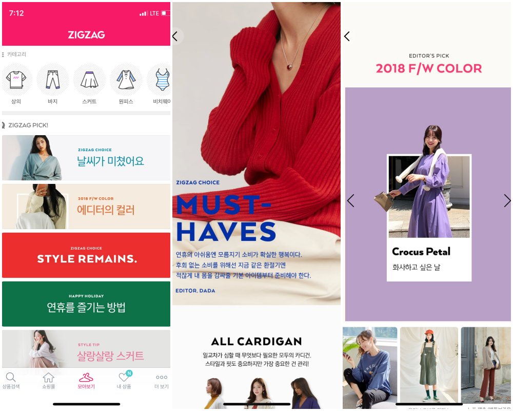 지그재그는 단순한 모음 앱을 넘어서고자 부단히 노력 중인 것 같습니다. 그 대표적인 예가 모아보기 화면의 '지그재그 픽' 섹션이 아닐까 싶은데요.
