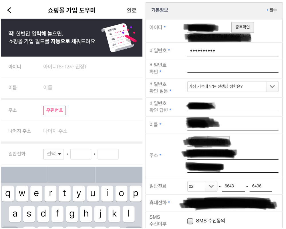 먼저 가입에 필요한 공통항목을 기입합니다. 그리고 도우미를 ON 상태로 설정해놓으면, 각 쇼핑몰 가입 페이지로 진입했을 때 자동으로 인식해 공통 요소를 채워주는 거죠.