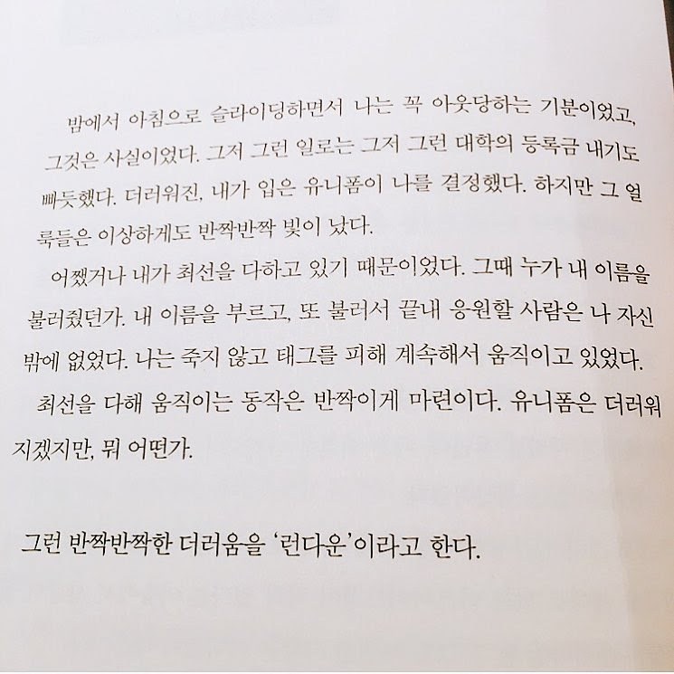 아직은 구장 가득한 응원가가 들리지는 않더라도, 최선을 다하는 매일이 쌓이면 어떤 멋진 날이 곧 오지 않을까요? 그런 날들을 설명하기에 제가 생각하는 가장 멋진 '야구적 표현'이 바로 '런다운' 인 것 같습니다. 그래서 야구라는 스포츠의 낭만을 아주 멋지게 그린 제가 좋아하는 책의 한 구절을 위에 사진으로 붙여봅니다.