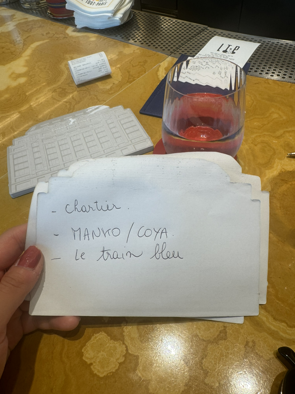 마지막으로 바텐더 분들께 프랑스 전통 음식을 즐길 수 있는 캐쥬얼한 식당 추천을 요청드렸는데요, 이렇게 추천 글까지 적어주었습니다.